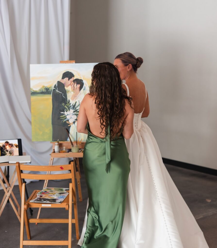 Live wedding painters don’t just create a lasting keepsake—we also entertain! Guests love watching the painting unfold, often checking back in throughout the night. I’m always happy to chat about the process, crack a few jokes, and even hit the dance floor if the Cupid Shuffle comes on.