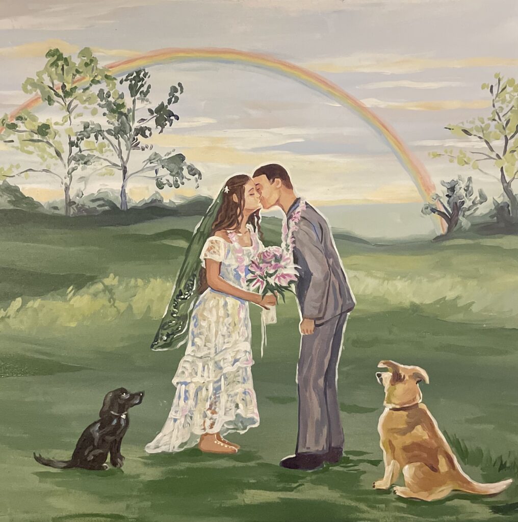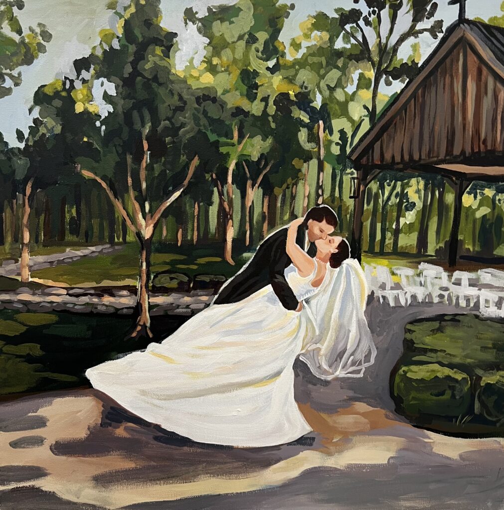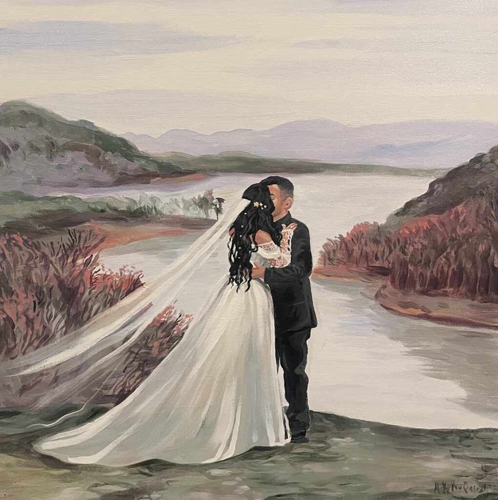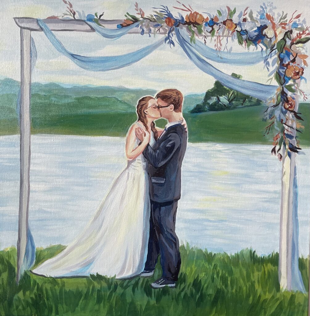 My art style has been described as airy and whimsical. I don’t strive for photorealism in my work, rather than achieve a perfect representation of a photograph, I aim to capture the feeling of the wedding itself… the vibes. You’ll see my brush strokes, the purposeful whimsy and fanciful light dancing around the composition.
